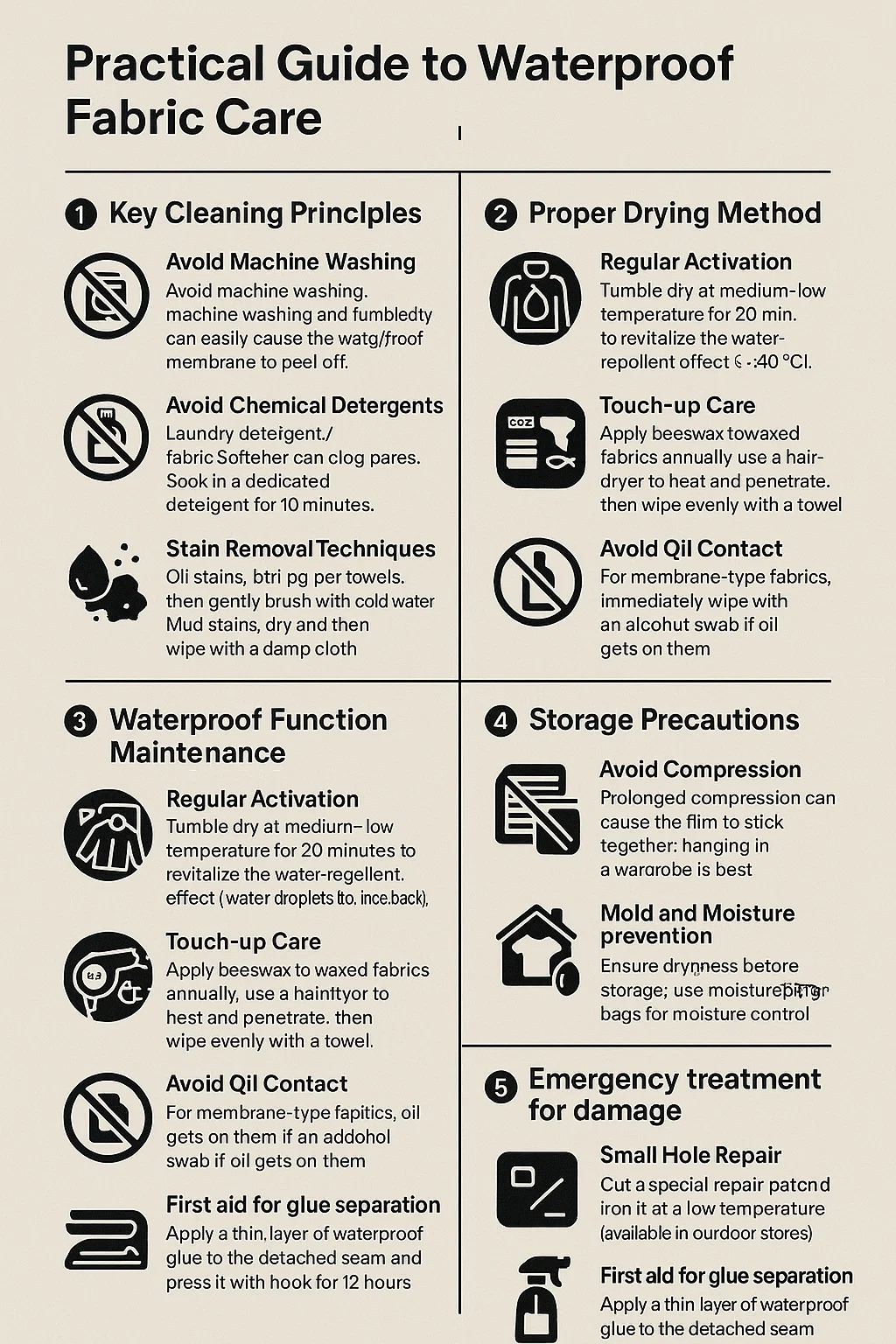 Undgå strygning: Højtemperaturstrygejern beskadiger direkte det vandtætte lag; rynker vil forsvinde, når de hænges.
