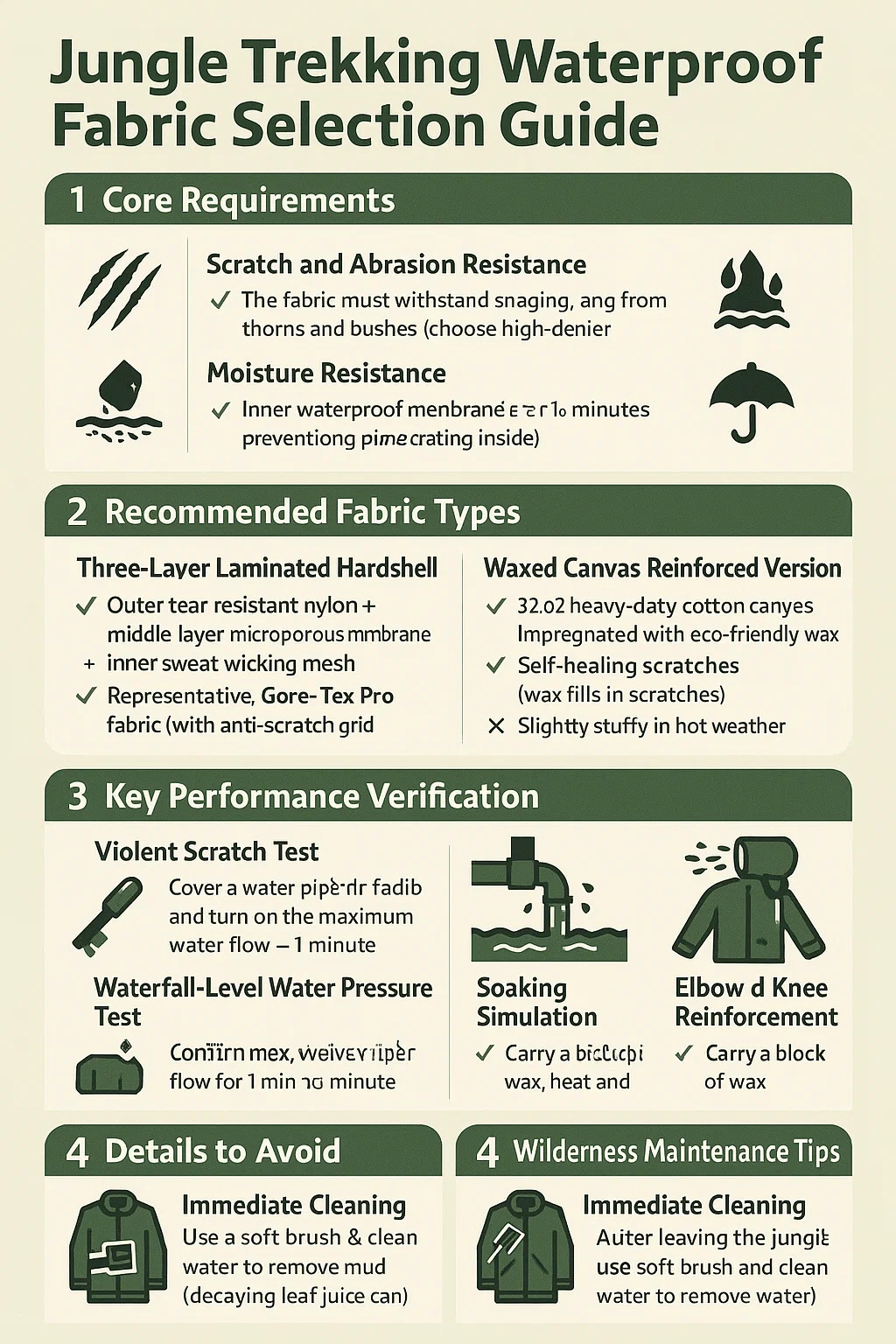 Tre-lags lamineret hård skal: • Yderste lag rivefast nylon mellemlag mikroporøs membran indre lag svedtransporterende mesh • Repræsentativ: Gore-Tex Pro stof (med anti-ridse gitter) • Undgå tynde 2,5-lags stoffer (som let rives af buske).