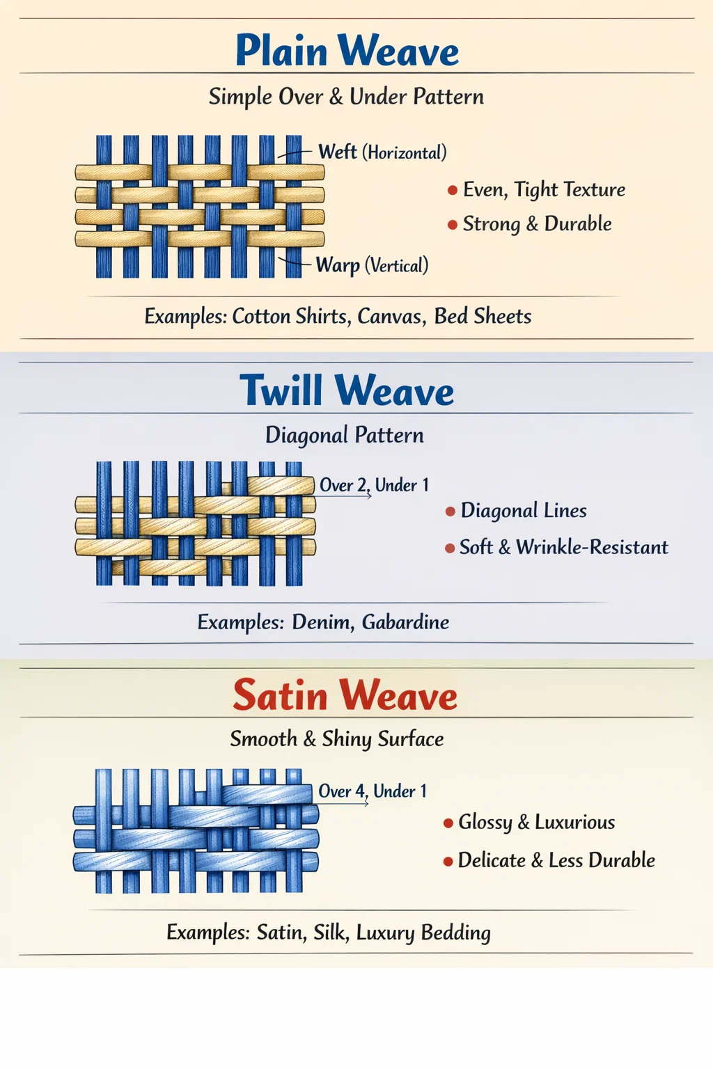 I tekstilindustrien næsten alle vævede stoffer er afledt af tre grundlæggende væveteknikker. Disse tre vævemetoder bestemmer stoffets udseende, holdbarhed og følelse.