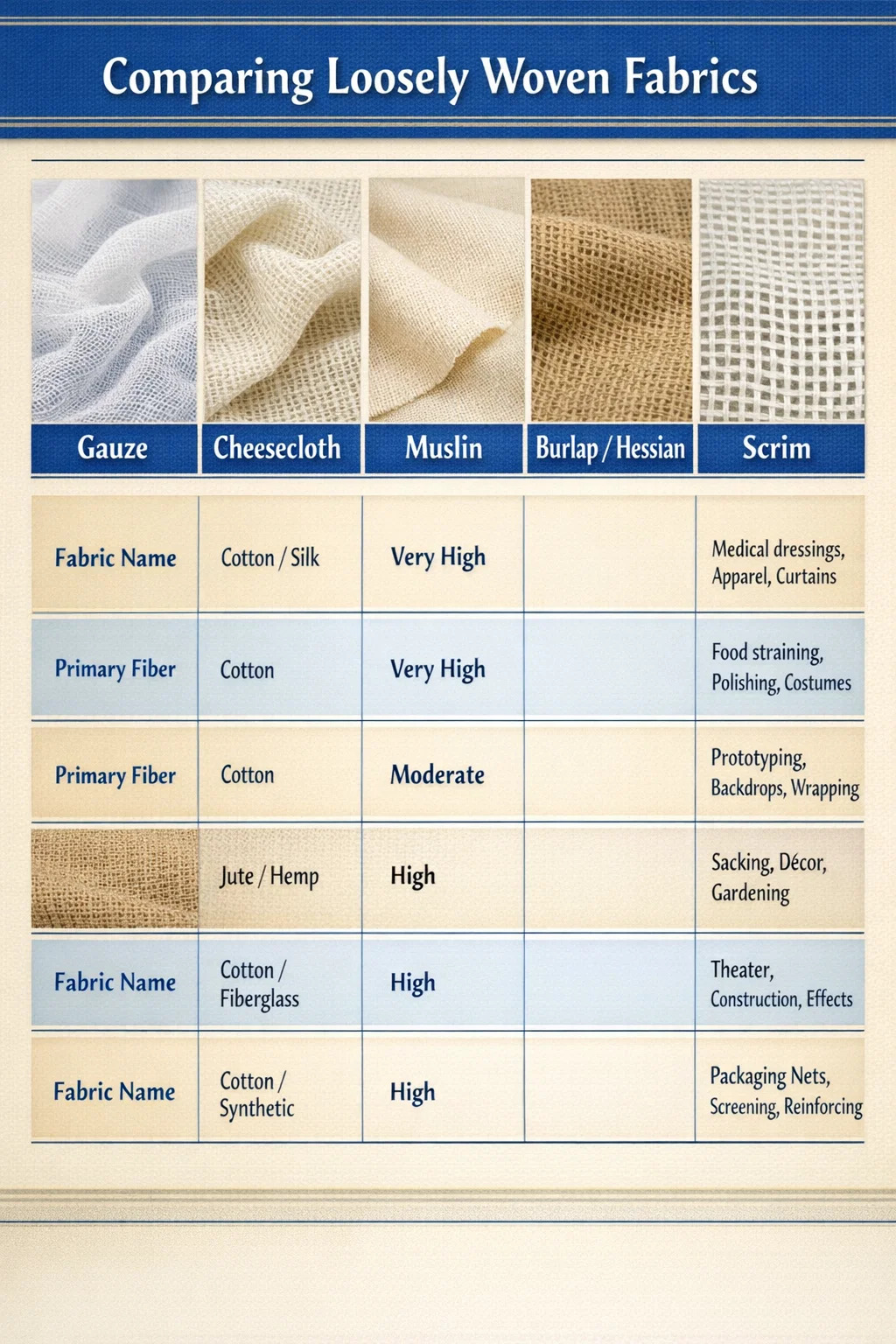 Tabellen nedenfor opsummerer de vigtigste egenskaber og primære anvendelser af de mest almindelige løst vævede stoffer for at gøre valget ligetil.