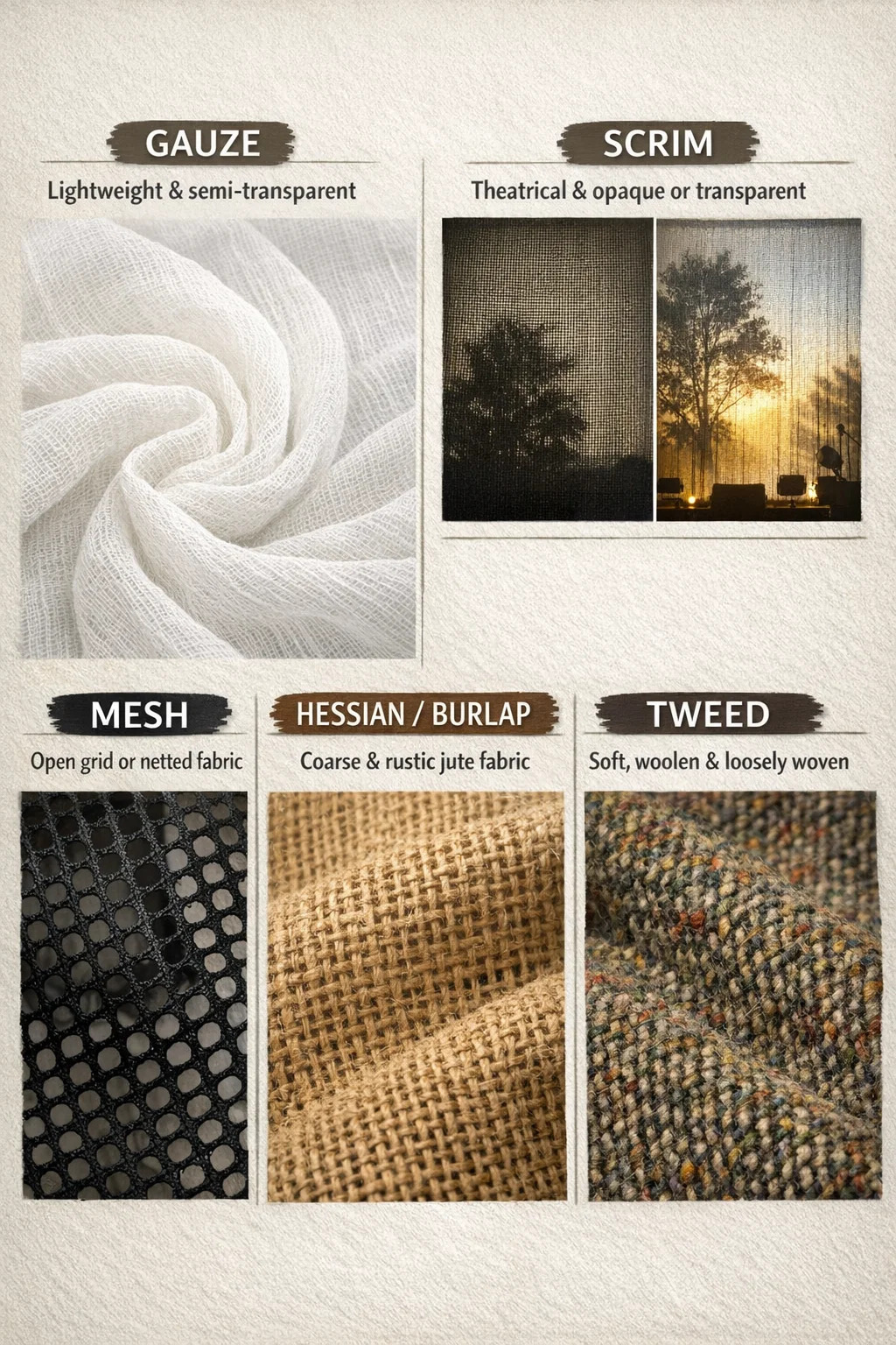 Når man taler om vævede stoffer med en "løs tekstur og store mellemrum," er der flere meget specifikke udtryk til at beskrive dem, afhængigt af deres brug og udseende.
