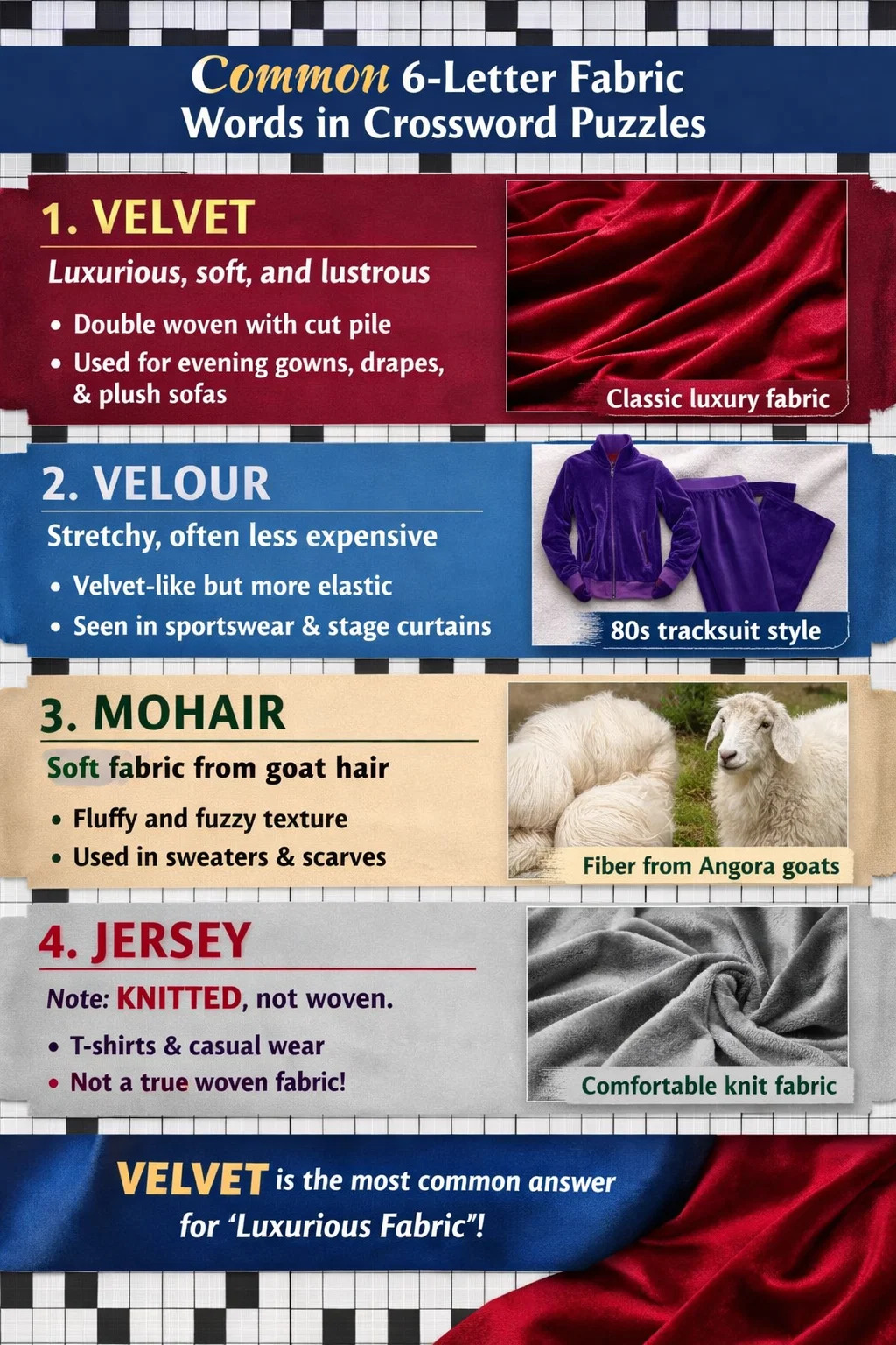 I krydsord, hvis ledetråden beskriver en "luksuriøs, blød og fløjlsagtig" 6-bogstav vævet stof , det mest klassiske svar er VELVET.