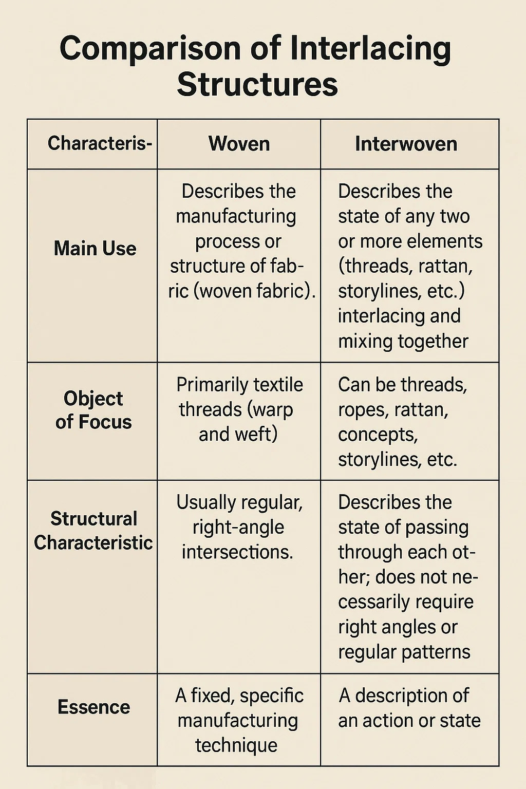 • "Interwoven" er et ord, der understreger handling og tilstand, og dets betydning er bredere end "vævet", ikke begrænset til stof. Den beskriver tilstanden af to eller flere ting, der er sammenflettet og tæt blandet sammen.